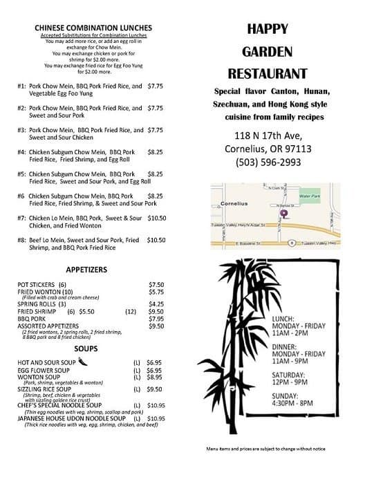 118 N 17th Ave Cornelius OR 97113 USA. Happy Garden Chinese has updated their hours takeout delivery options. Due to Covid-19 restaurant open hours and service may differ.